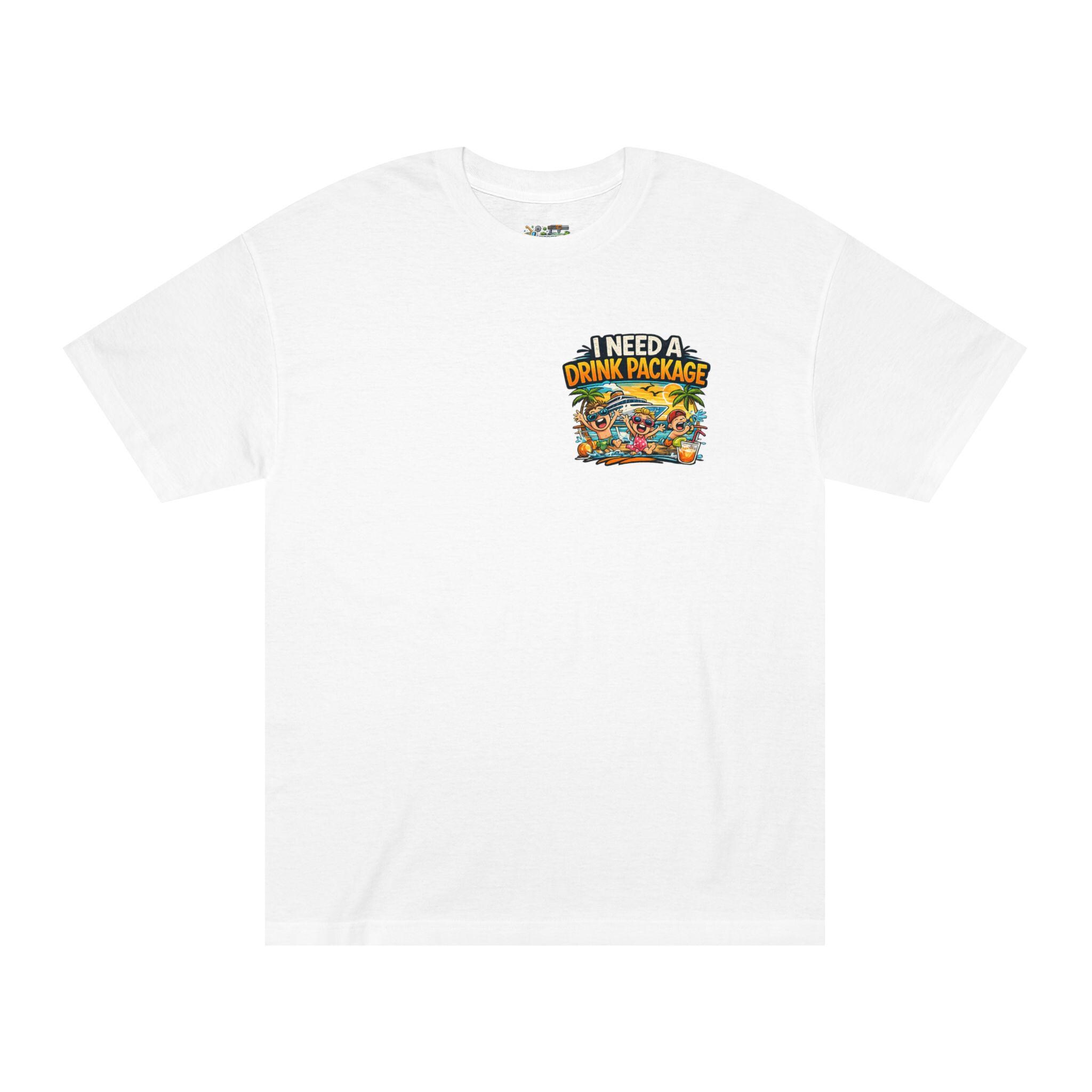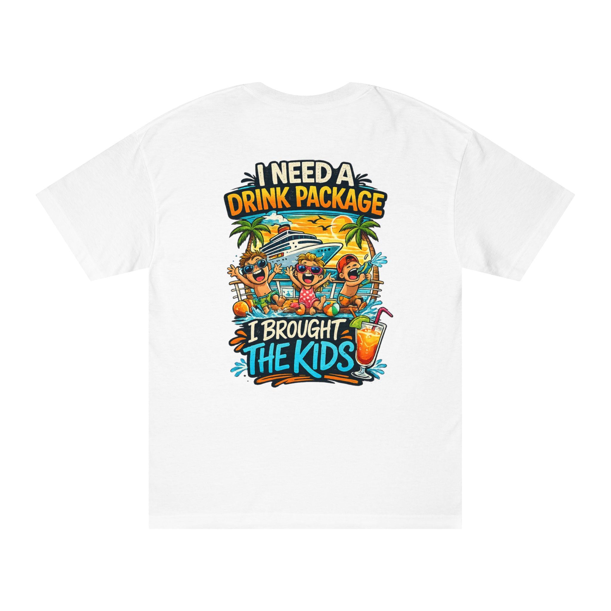 A laid-back classic tee that channels vacation chaos into a grin. Bright, retro-inspired artwork reads “I need a drink package — I brought the kids,” with a sun-soaked beach scene, palm trees, and playful characters. The artwork sits small on the chest and large across the back, so the message lands with a wink whether you’re grabbing coffee or corralling the crew on shore. This cotton-weight shirt keeps its shape, breathes in warm weather, and wears like an old favorite after repeated washes. It’s the kind of shirt that sparks laughs at the pool, eases the mood during family travel, and becomes your go-to when you want to say “surviving vacation” without a word.