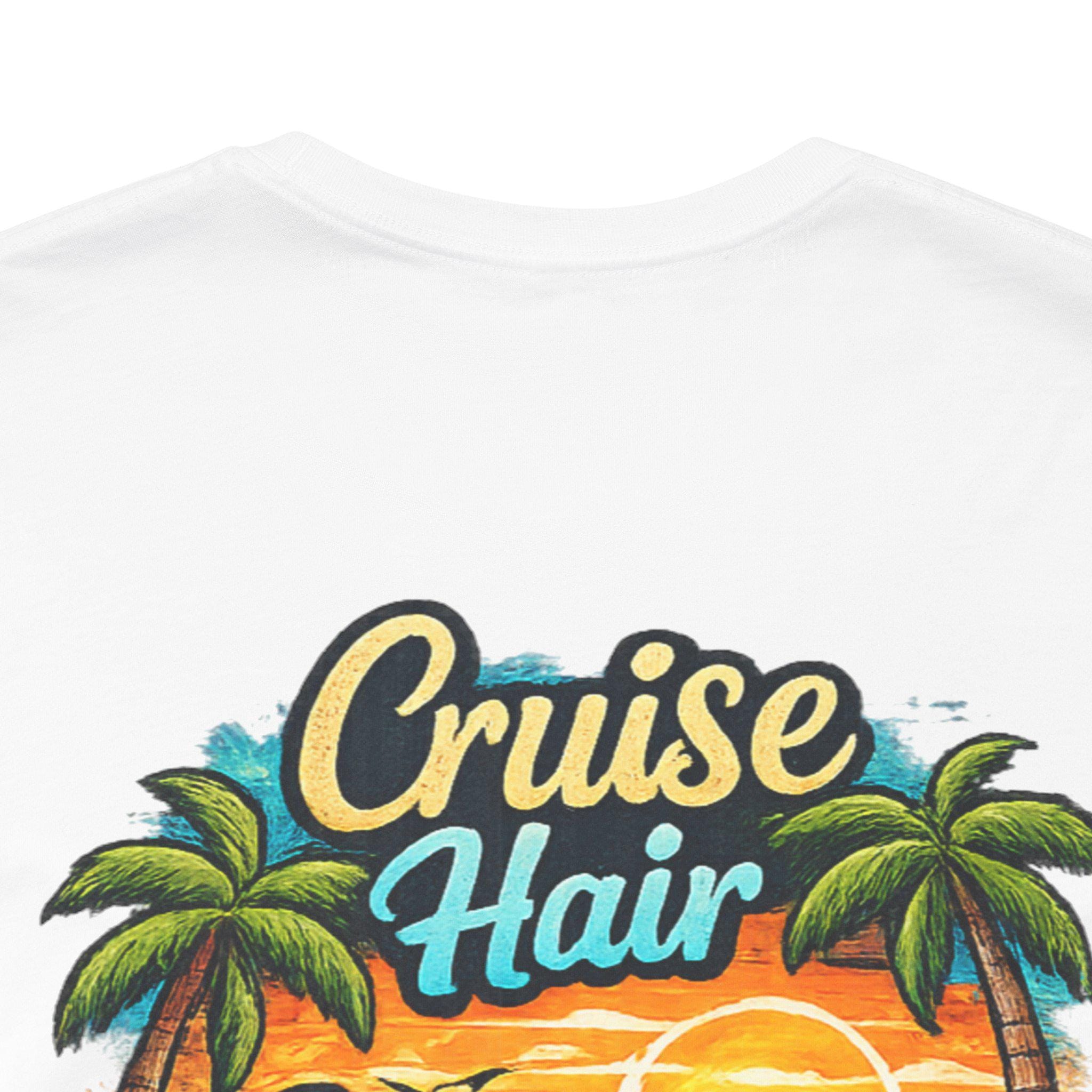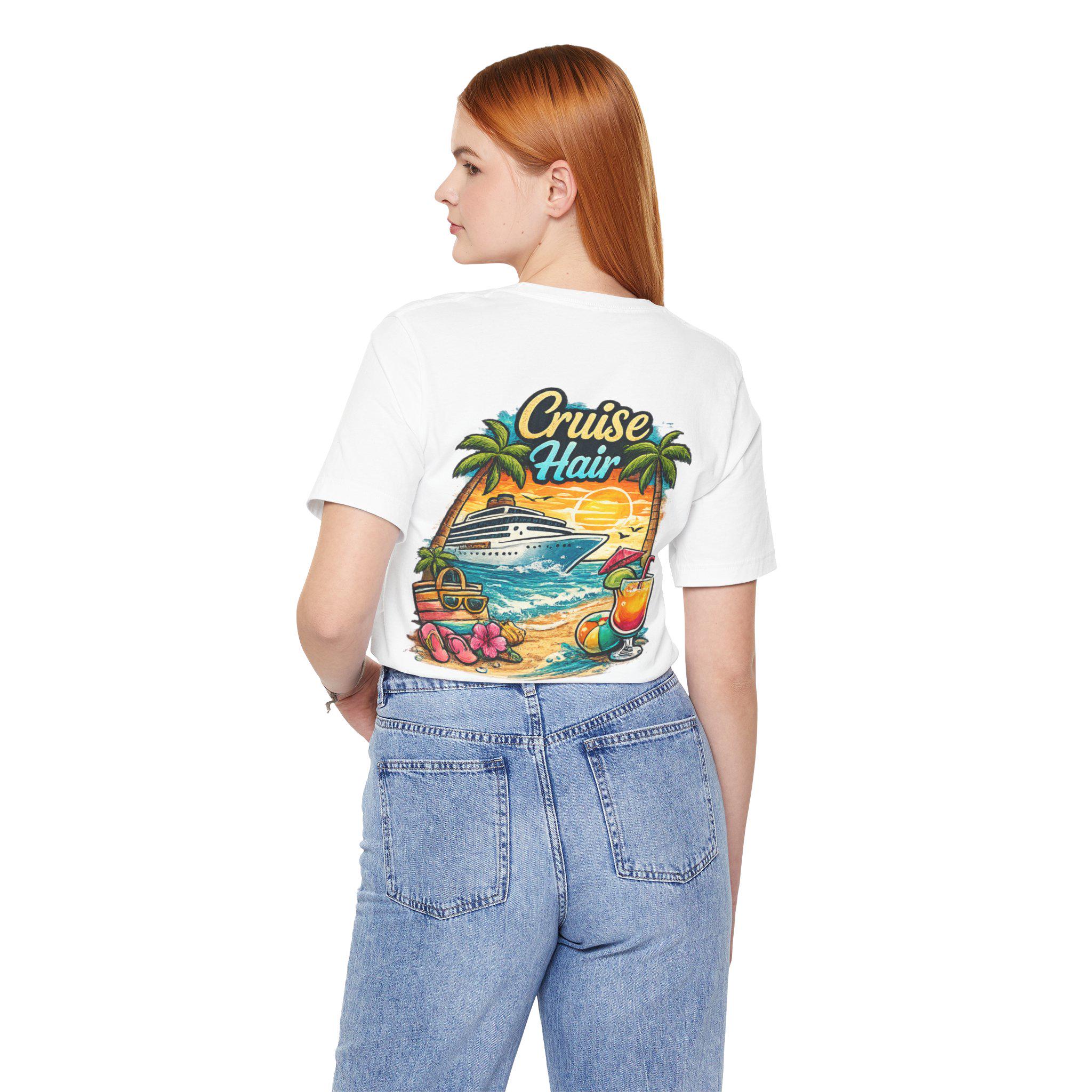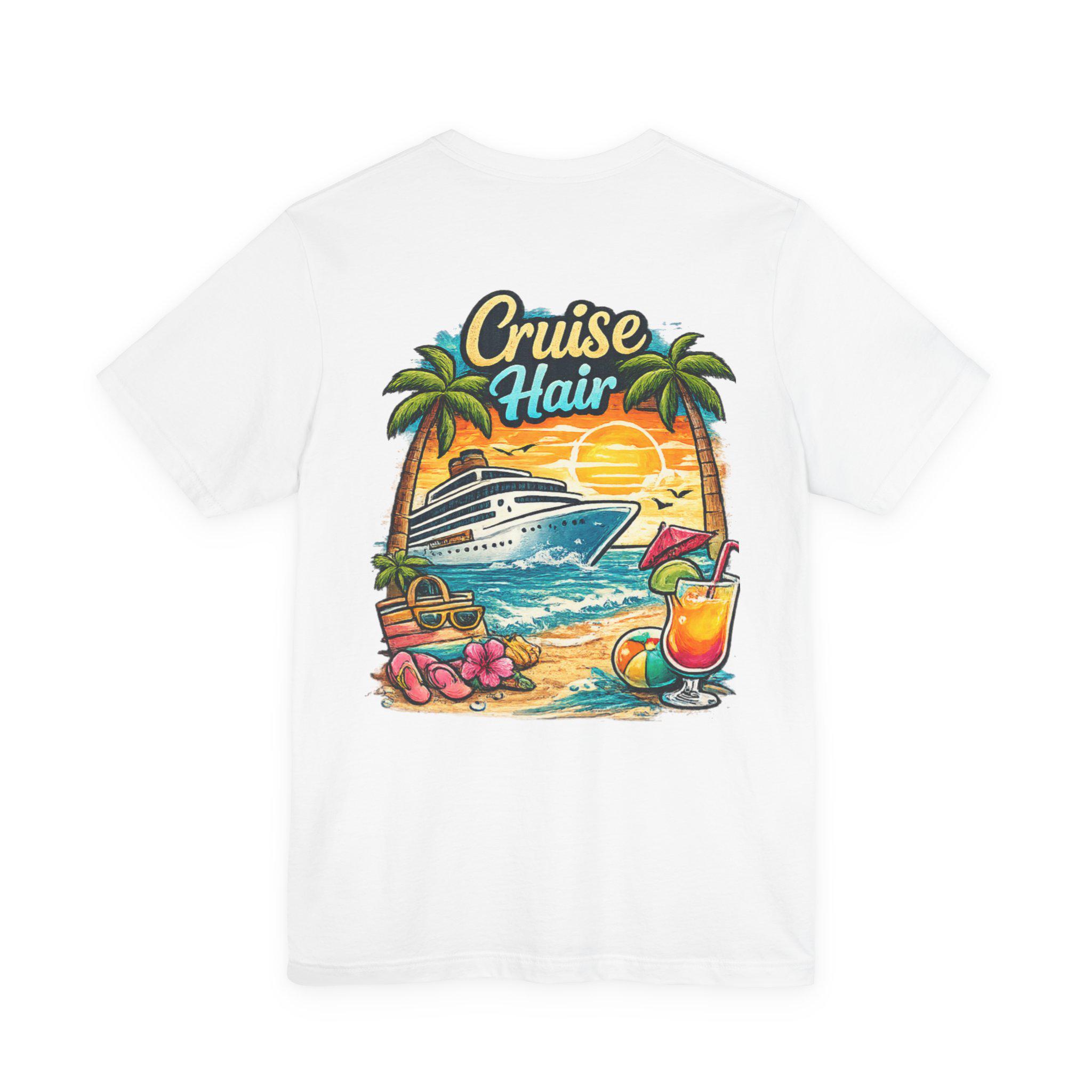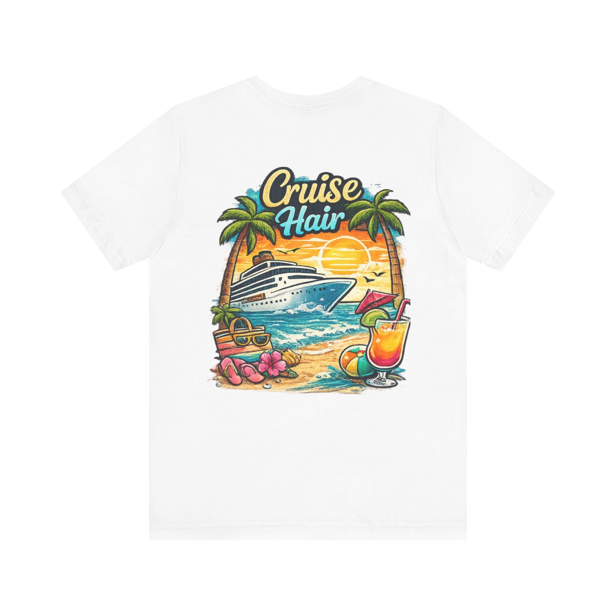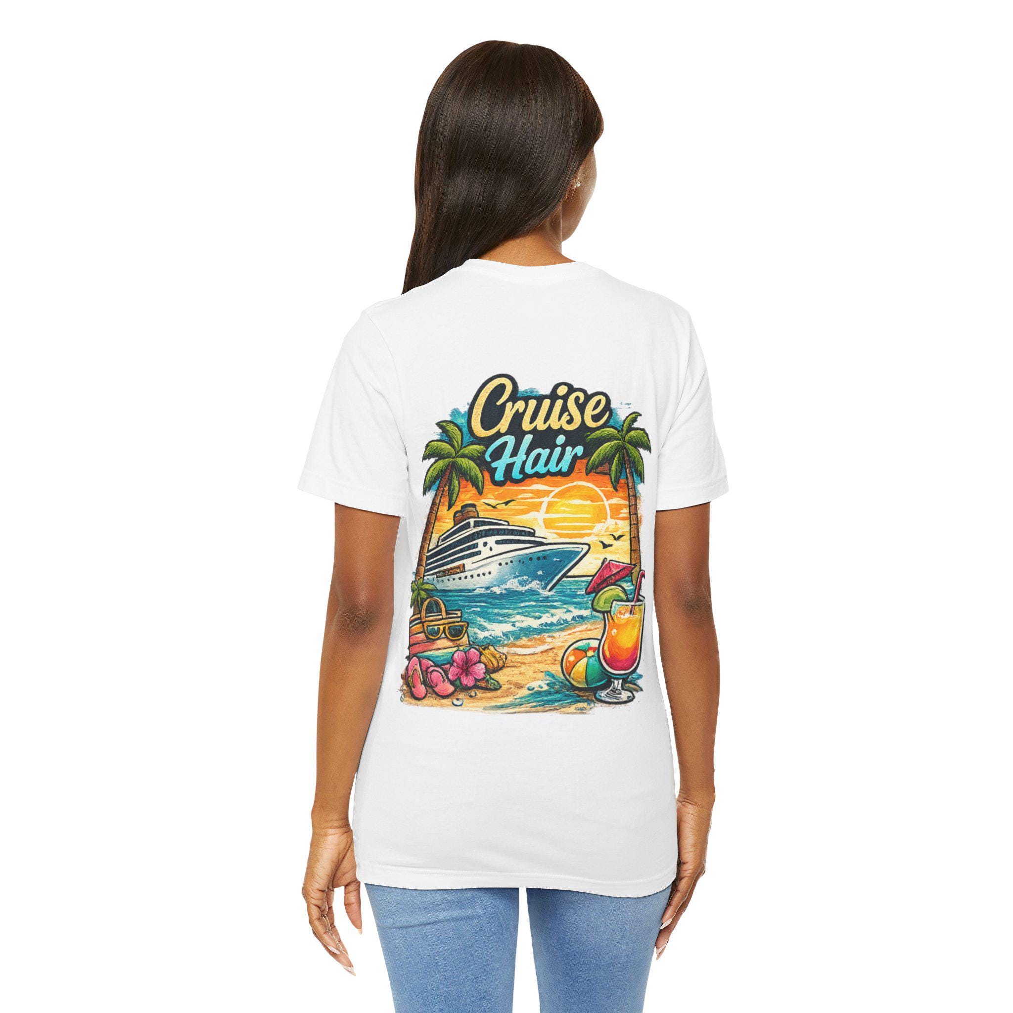 Light, breezy, and full of sun-soaked attitude — this tee carries the slow hum of ocean waves and the warm scent of sunscreen. A colorful cruise motif rests on the chest and blooms across the back: a sunset, palms, a ship cutting through turquoise water, and a tropical cocktail waiting on the sand. Wear it on board or off; it reads like a memory turned into fabric — the laughter on deck, wind-tousled hair, and the easy pause between ports.