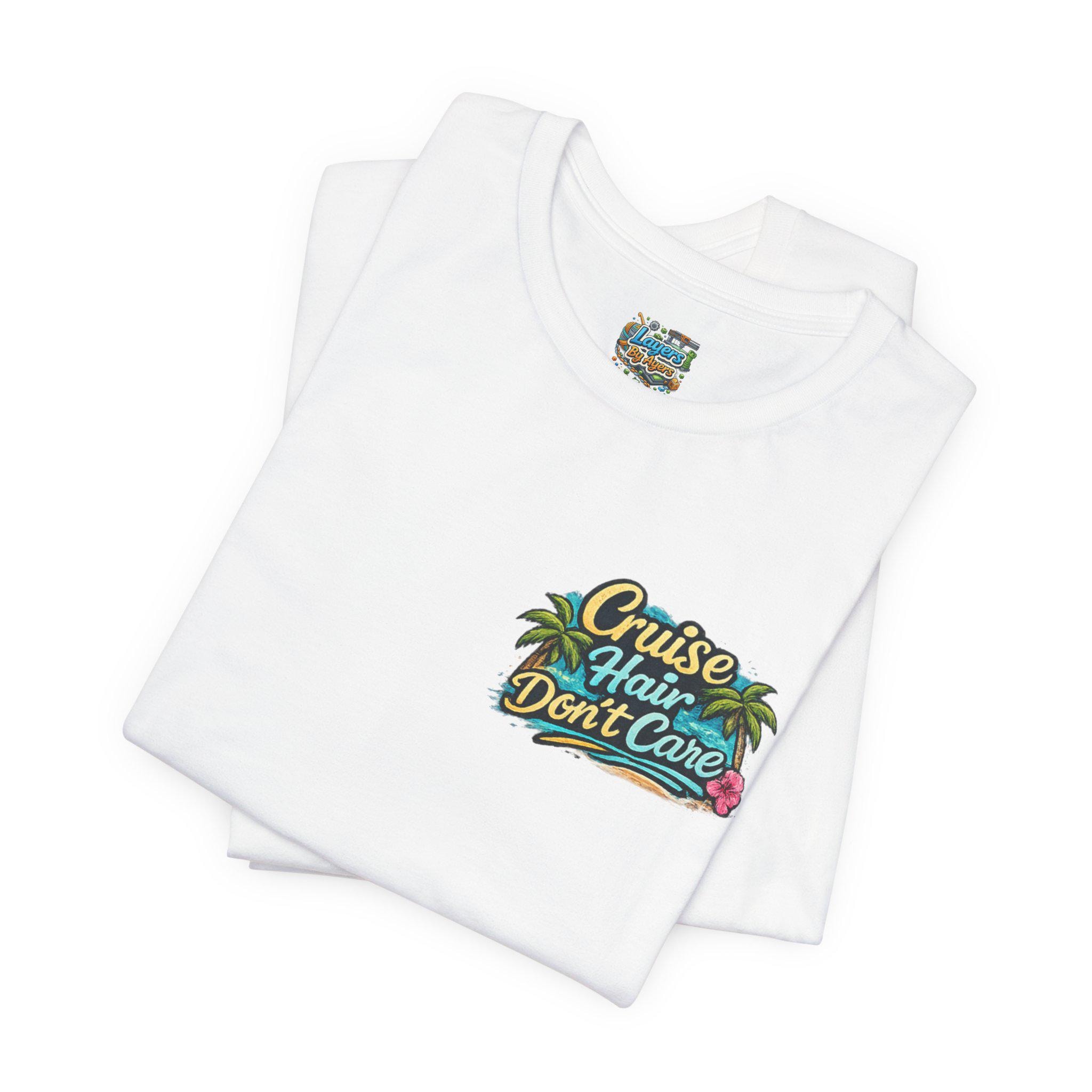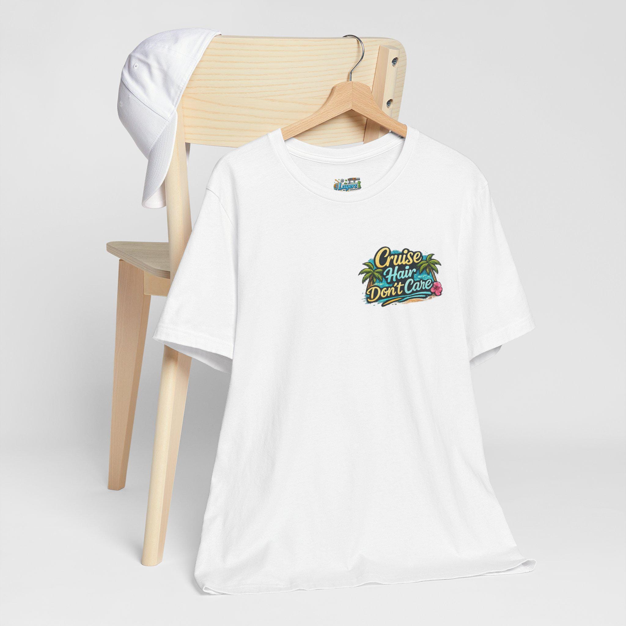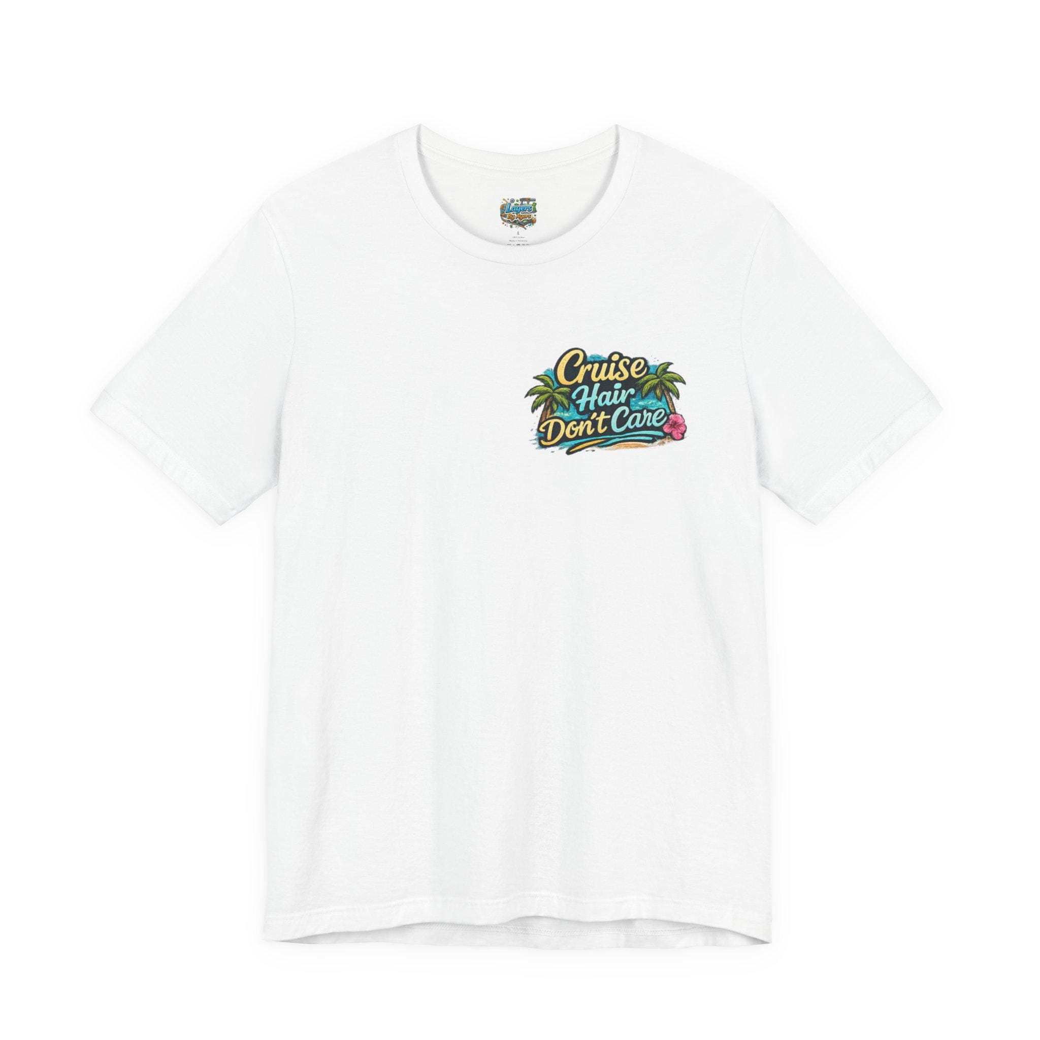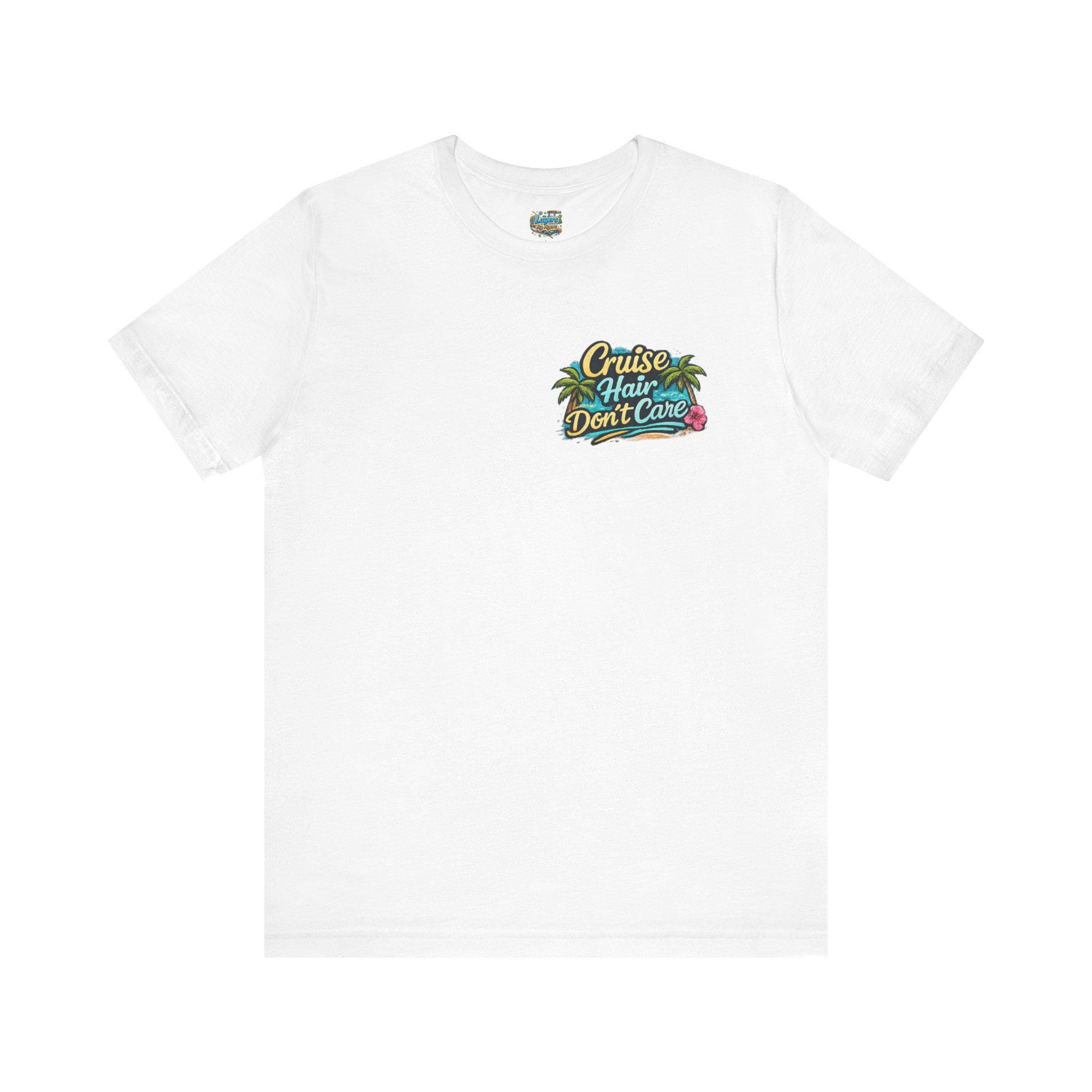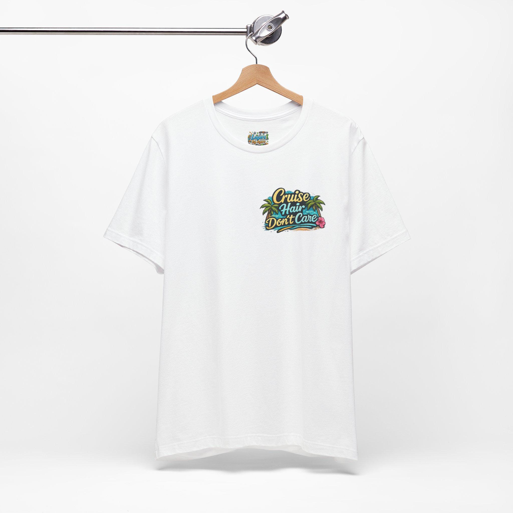 Light, breezy, and full of sun-soaked attitude — this tee carries the slow hum of ocean waves and the warm scent of sunscreen. A colorful cruise motif rests on the chest and blooms across the back: a sunset, palms, a ship cutting through turquoise water, and a tropical cocktail waiting on the sand. Wear it on board or off; it reads like a memory turned into fabric — the laughter on deck, wind-tousled hair, and the easy pause between ports.
